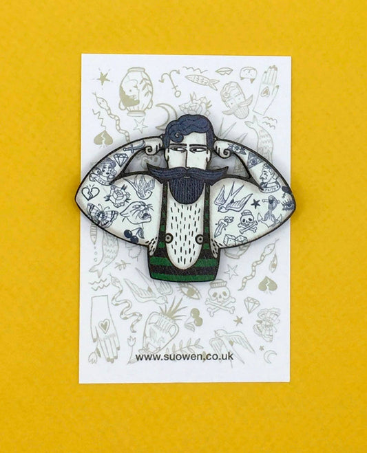 Save Our Seas tattooed Hands Wooden Pin Brooch