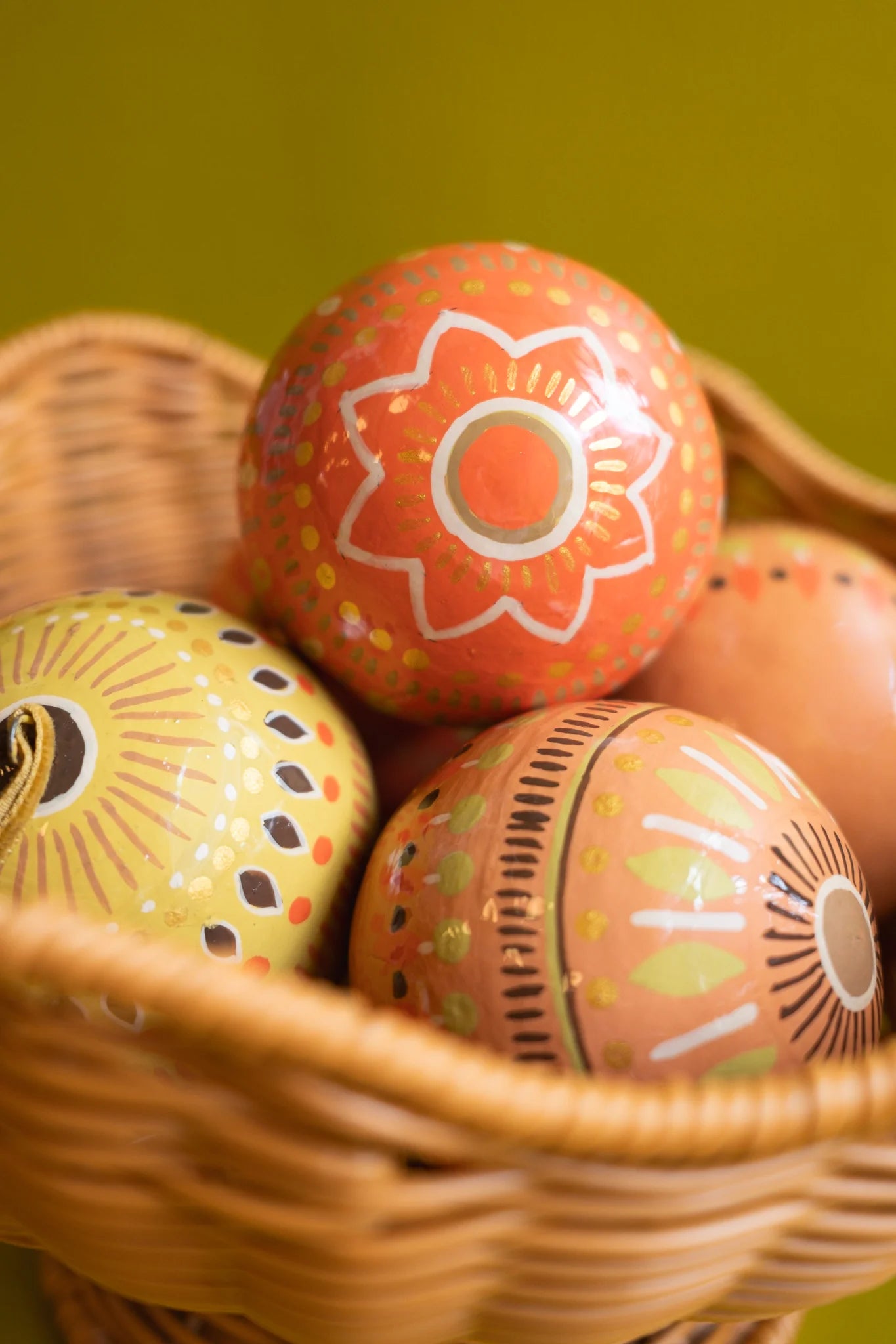 These beautiful baubles are all made from papier mâché recycled paper, hand-painted with intricate, colourful illustrations, and have a soft velvet hanging loop.