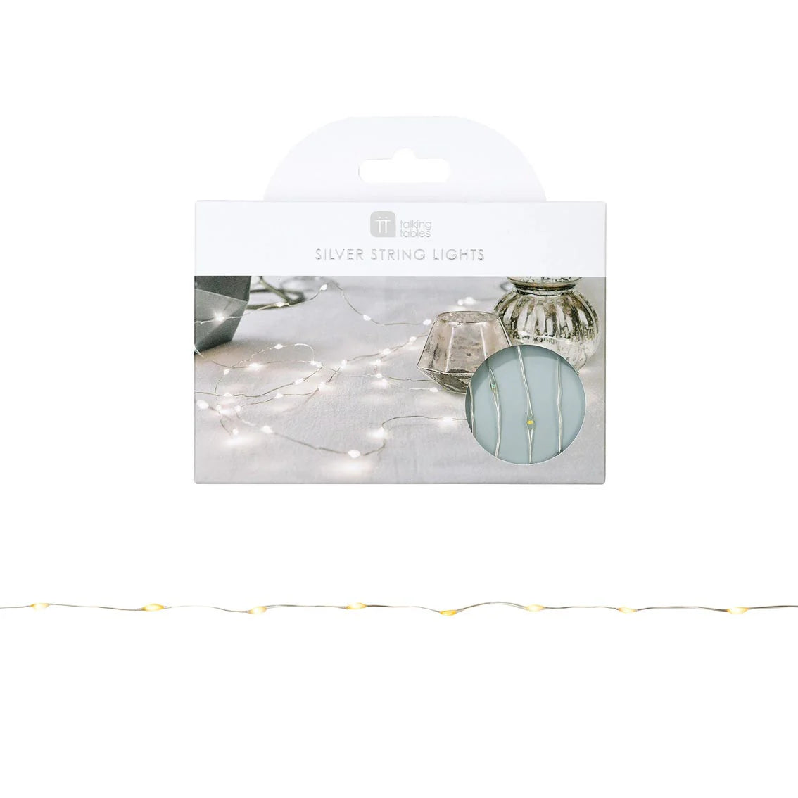 hese dainty string lights will add a warm glow to your table setting or home décor. 3 meters in length and battery operated. Batteries not included.