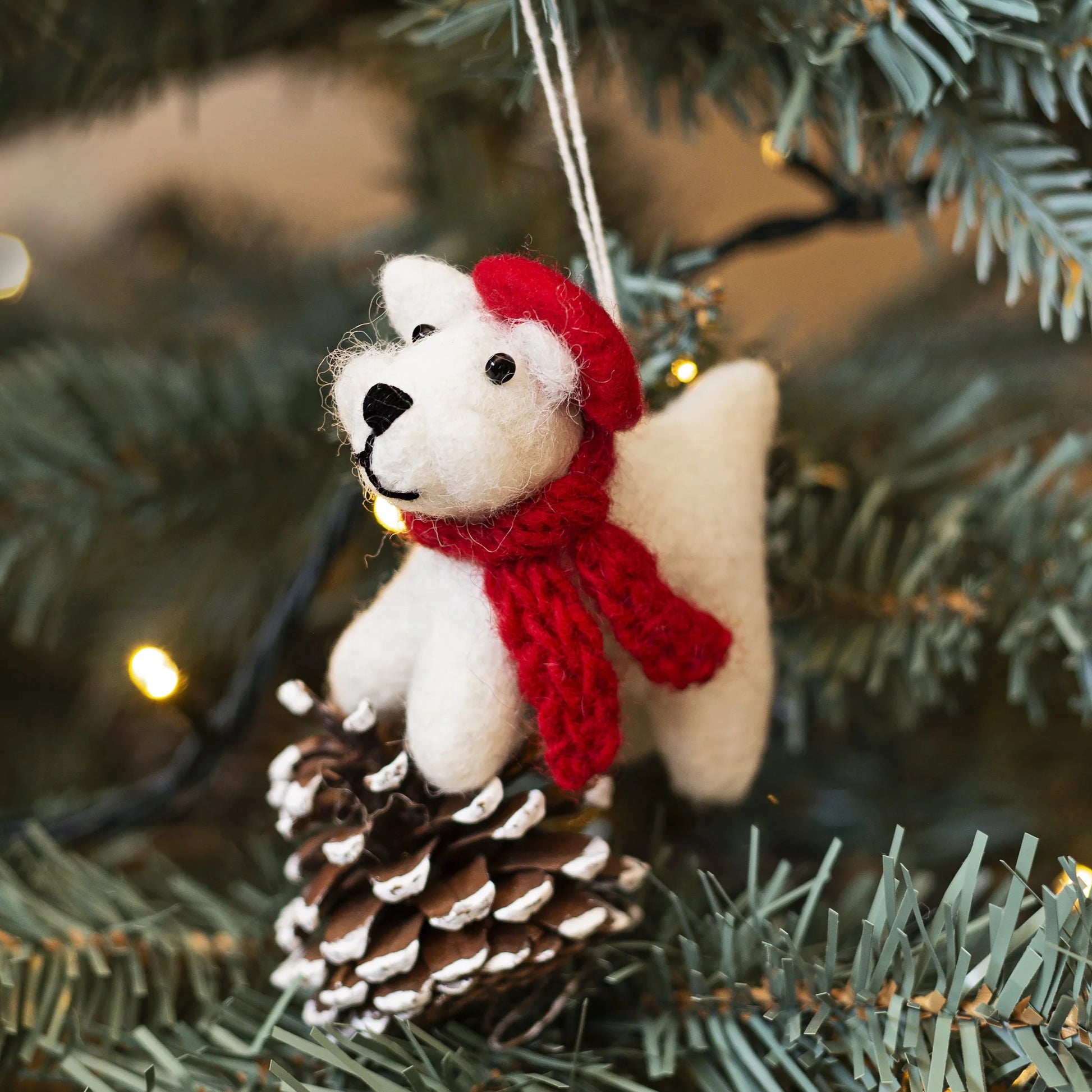 Our little White Westie comes complete with a little Tam O'Shanter and knitted scarf. Just gorgeous! A great decoration for your Christmas tree.